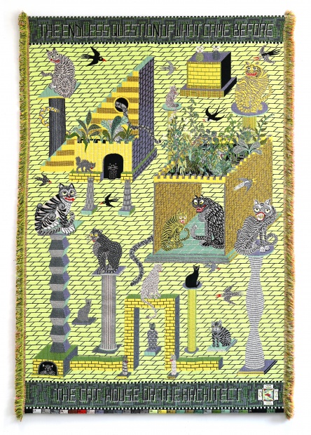 Koen Taselaar, The Endless Question Of What Came Before, The Cat House Or The Architect, 2022, ed. of 3, jacquard woven, 240 x 170 cm