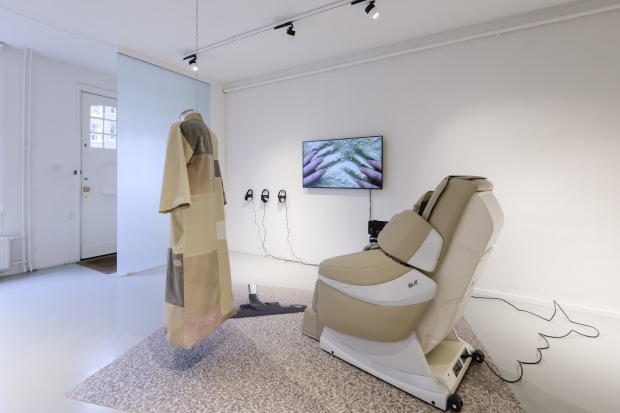#satisfyingslime is the title of Emmeline de Mooij’s first exhibition at our gallery. The centrepiece is the sculpture Poging tot een Dutje (Attempt to Take a Nap) in which the visitor also becomes performer. An electrically-powered massage chair relates a story about the internet sensation ‘slime videos’ and ‘ASMR’. Slime videos are clips posted to Instagram that show a slimy substance being kneaded by a woman’s hands; some depict plastic objects disappearing into the gunk. The videos fall under the popular YouTube genre ASMR (Automated Sensory Meridian Repose), videos in which women address the viewer, whispering softly, and give them ‘personal attention’ by miming the act of hair-washing, or taking an optician’s eye test.