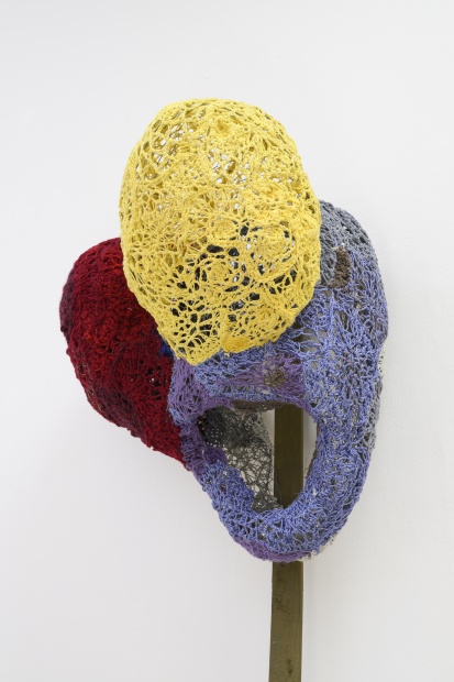 For her Club Solo exhibition, Peeters has made three new works, each of a considerable size and on unstretched linen. An elongated light-grey canvas shows a picture emerging from a vertical mid-axis. Exuberantly fanning lines, made of stitching, seem to roll out to the edges of the book. It is a dynamic whole, with subtle nuances of colour ranging from blue-grey to sea-green and shades of brown. At its edges, the drawing is not constricted by a frame; the lines seem to move freely into the room, the edges of the loose canvas following the drawing. This flowing form recalls Don't try this at Home (1994) (not catalogued), a psychedelic crochet of brightly-coloured flower motives that spreads out over the wall in freely flaring shapes. Likewise, the recent grey canvas escapes the frame, the pattern, the symmetry and the motive. All that remains is a suggestion of space, movement and boundlessness, in an unframed picture that silently conforms to the two-dimensional plane.