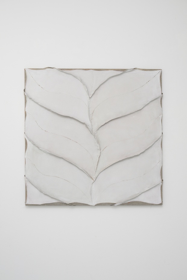 In the downstairs room of Club Solo, there is a large, white painting that shows a leaf pattern branching off from a vertical axis. Protruding seams stitched to the canvas provide texture and contours. The thin stitches on the flat plane are under apparent tension, creating small, dark openings in the surface. The canvas is prepared and painted white, with the outer edge left open, showing the brown-grey of the painter's linen. There, the protruding seams make sculpture-like folds around the edges of the stretcher bars, in a wavy rhythm that reinforces the drawing. The entire creation process - the preparation of the canvas, the stitching, the stretching and the painting - is visibly constituted in the work. From a distance, an almost schematic motive is seen, up close, all operations are clearly visible, as well as a range of shades of white, dissolving the pattern. It is a painting of silenced beauty, in which the image and the medium correspond in an intriguing fashion and the picture coincides with the material. The "sculpted" painting moves in the area that separates plastic arts from paintings, on which Peeters commented “... it seems that this is what I’m interested in, that place between real spatiality and the surface. I always wonder what the flat plane actually is, how it can be broken and where the painting eventually ends”.